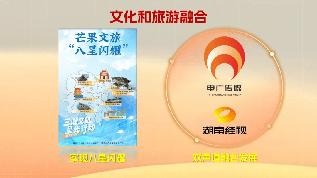 电广传媒与湖南经视经营性业务全面融合,双向赋能,用产业逻辑探索地面频道转型路径。未来湖南广电还将创新打造自有IP一站式主题乐园、城市潮流文化街区、沉浸式戏剧互动演出、芒果livehouse等更多文旅消费新场景◁。